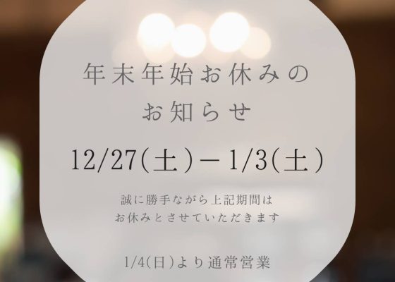 【年末年始営業時間のお知らせ】 いつもご来店いただき誠にありがとうございます。 誠に勝手ながら、下記の通り年末年始お休みとさせていただきます。 2024/12/28(土)〜2025/1/3(金) 2025年1月4日(土) […]